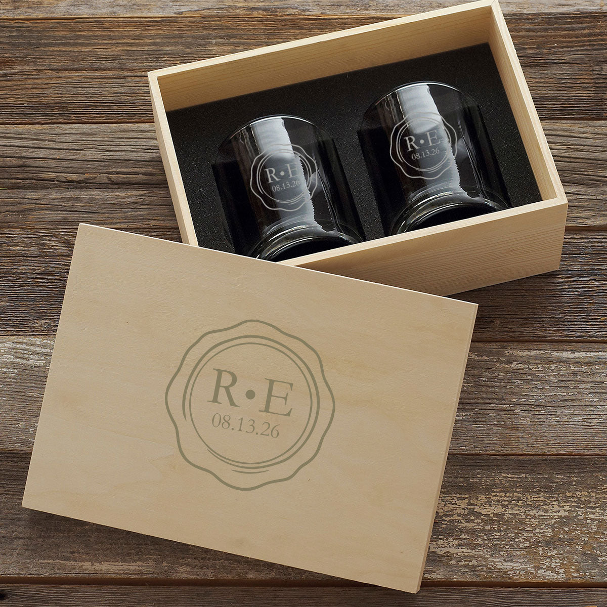 Couples Signature Etched 2‑Piece Rocks Glass Set in Personalized Wood Box