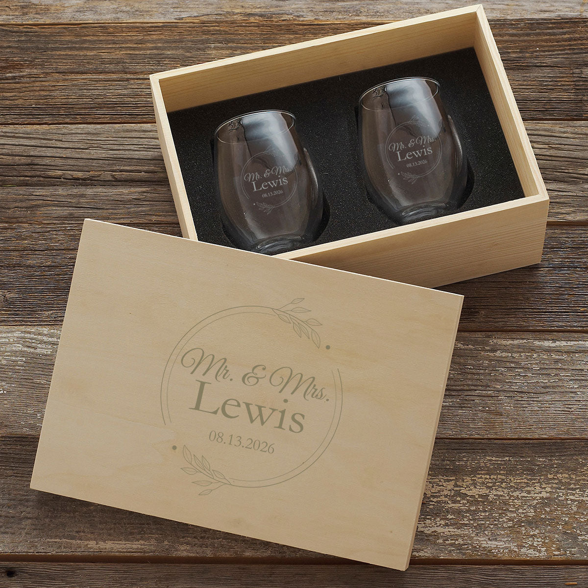 - Two premium stemless wine glasses, each individually laser‑etched with your chosen design, names, initials, or special date.