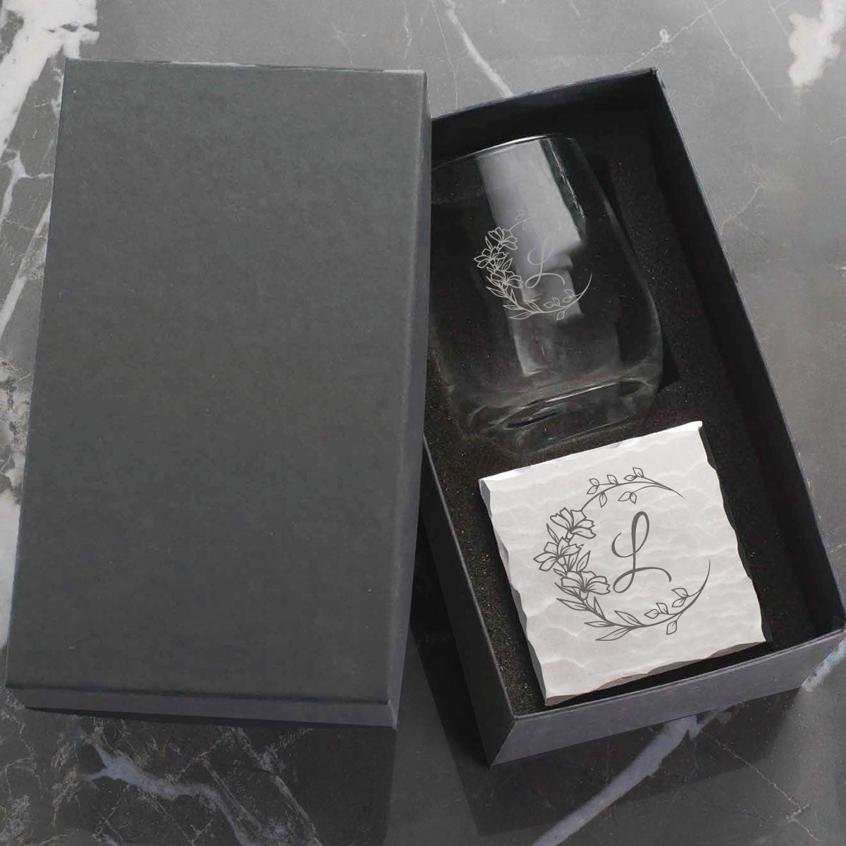 - Personalized Initial & Matching Design: Your chosen monogram and artwork appear on both the glass and coaster.