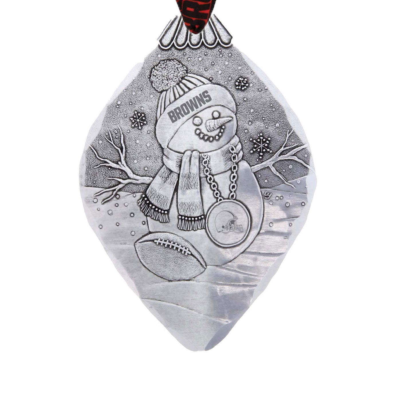 Celebrate your love for the Cleveland Browns with this charming aluminum Superfan Snowman Ornament. Hand-hammered and expertly crafted, this snowman dons a logo tossel cap and an oversized superfan chain featuring the iconic Browns logo. A delightful addition to your holiday décor or gift for a fellow fan, this ornament is a must-have for any dedicated Browns enthusiast looking to showcase their team spirit during the festive season.