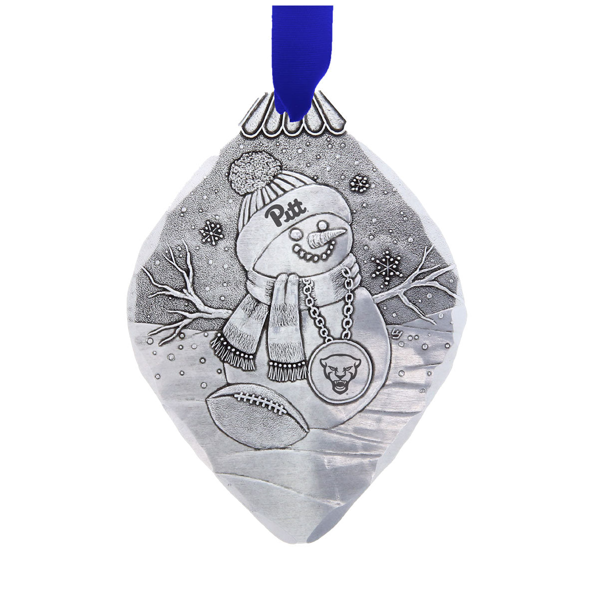 Celebrate your love for the University of Pittsburgh with this charming aluminum Superfan Snowman Ornament. Hand-hammered and expertly crafted, this snowman dons a logo tossel cap and an oversized superfan chain featuring the iconic Panthers logo. A delightful addition to your holiday décor or gift for a fellow fan, this ornament is a must-have for any dedicated Pitt enthusiast looking to showcase their team spirit during the festive season.