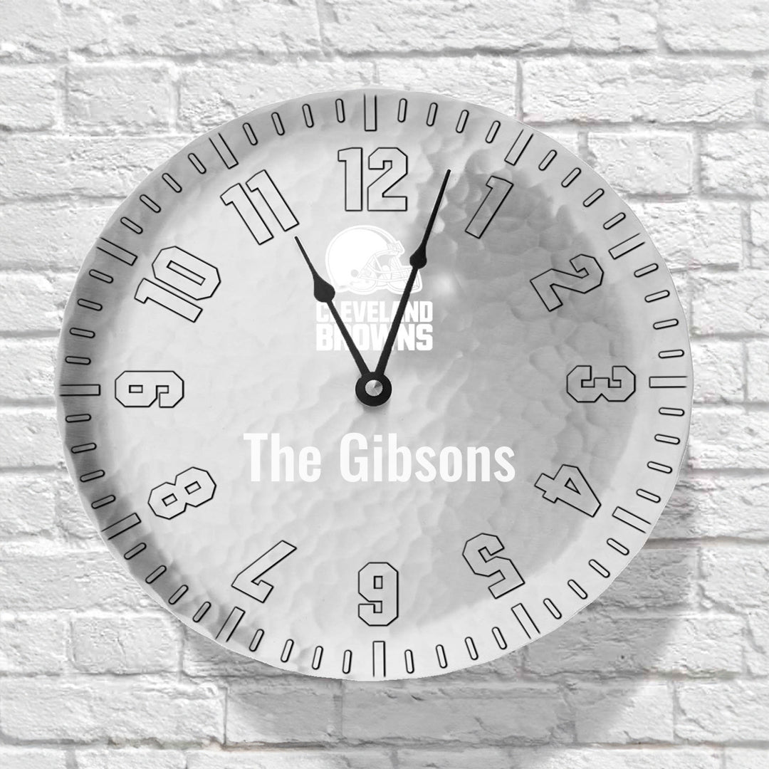 Keep track of time and showcase your Cleveland Browns pride with this Personalized Wall Clock. Featuring a sleek design with hand hammered numbers and engraved Cleveland Browns logo, this clock is the perfect addition to your home, office, or fan cave. Customize it with the name of your choice for a unique touch, and count down the hours to the next Browns game in style.