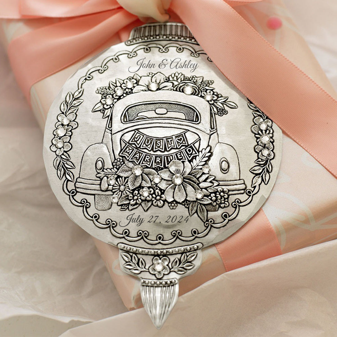 What sets this ornament apart is the option for personalization. Engrave the couple's names and wedding date, creating a treasured keepsake that celebrates their special bond. Whether displayed on a Christmas tree or hung in a special place year-round, this ornament is a beautiful reminder of love's enduring journey.